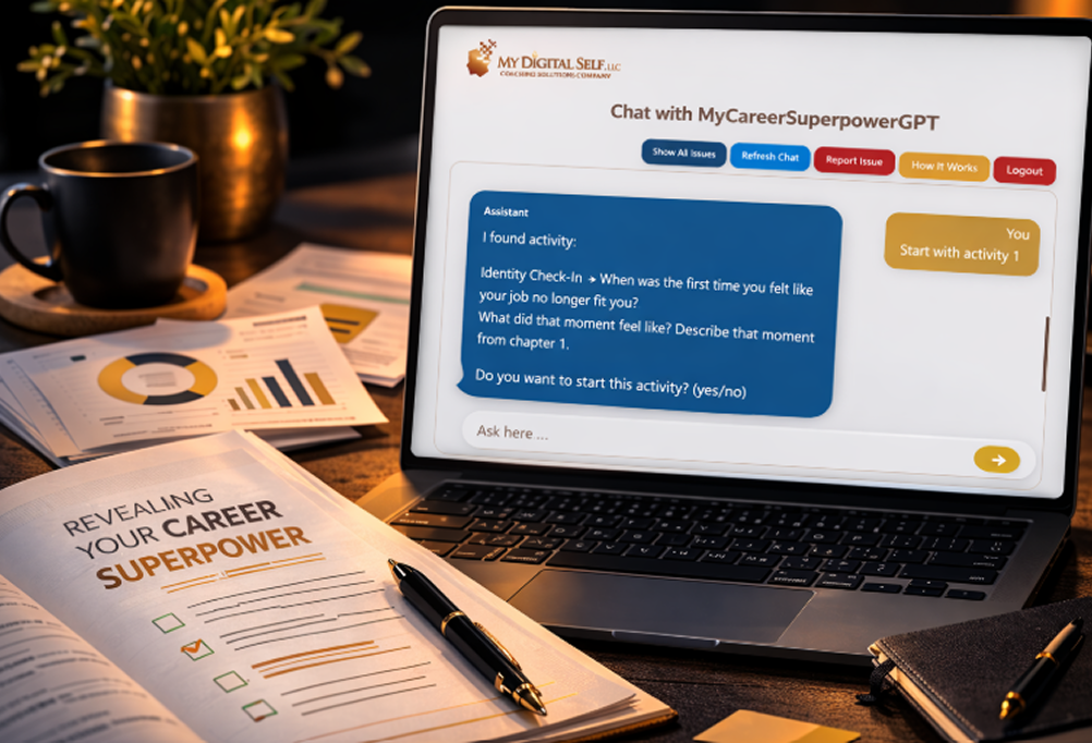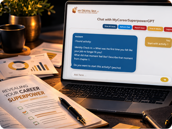 MyCareerSuperpowerGPT is trained on the MDS Career Identity System… your book, workbook, and the Identity & Success Report… so it guides you through the work with precision.